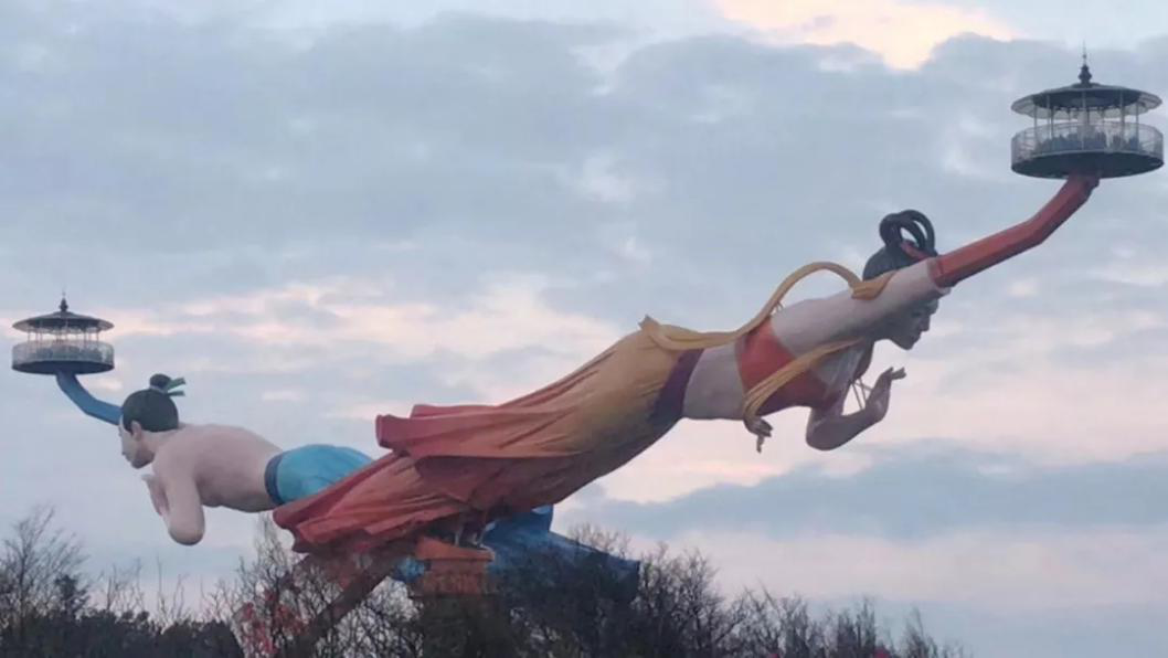“飛天之吻”建立在望仙崖一處懸崖邊上,主體總高52米,總重620噸,底座距崖底烏江的垂直落差1000余米。運(yùn)轉(zhuǎn)時(shí),南邊的飛行島代表白馬王子,北邊的飛行島代表仙女,一雙機(jī)械臂3分鐘內(nèi)可上升52米,雙島在高空定格后,旋轉(zhuǎn)307°交匯形成飛天之吻的景象。