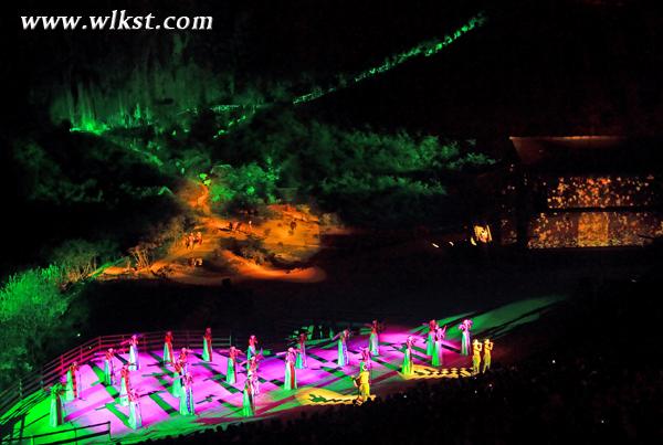 “印象武隆”實景歌會由印象“鐵三角”張藝謀任藝術顧問,王潮歌、樊躍任總導演,近200位特色演員現場真人真情獻唱,以瀕臨消失的“號子”為主要內容,讓觀眾在70分鐘的演出中親身體驗自然遺產地壯美的自然景觀和巴蜀大地獨特的風土人情。