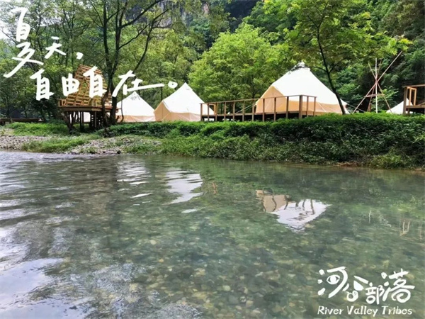 犀牛寨河谷部落露營基地位于重慶市武隆區土地鄉延滄河下游段梨子樹組,坐落在兩側峽谷茂林之中,谷底有清河碧波順流而過,寨內的土家族吊腳木樓依山而建,充滿了土家文化和歷史韻味,為人們展現了人與自然和諧相處的生活寫照。