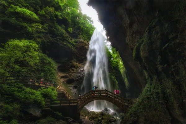龍水峽地縫,則是大地深藏于懷中的神秘裂痕。沿著棧道緩緩下行,兩側(cè)絕壁陡峭如削,飛瀑如練,從崖頂傾瀉而下,水花飛濺,似銀珠落玉盤,在陽(yáng)光的折射下,幻化成七彩霓虹。谷底幽深得仿佛通向地心,每一步都似在探秘未知的世界,心跳與腳步聲交織,奏響一曲冒險(xiǎn)的旋律。