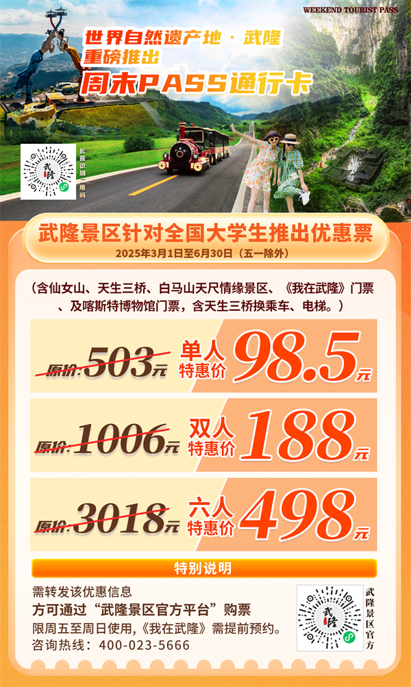 武隆景區針對全國大學生推出了周末PASS通行卡,3月1日至6月30日,單人、雙人及六人套餐,折扣低至1.7折,周五、周六、周日均可使用(五一假期除外)。