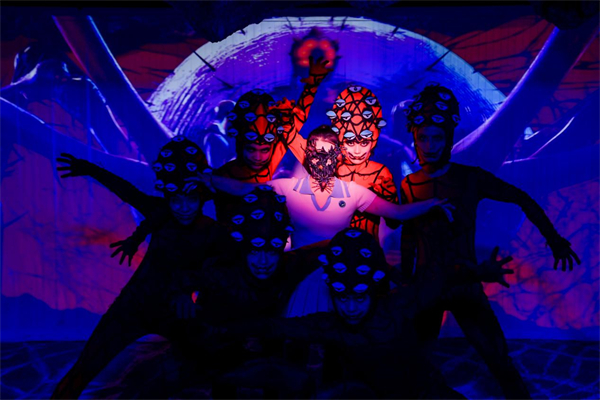 踏入《我在武隆》,光影交錯(cuò)間,舞蹈演員以曼妙身姿為筆,勾勒出一幅幅武隆的生動(dòng)圖景。你將看到演員與雷電共舞,穿越云層縫隙,沐浴在“天生三橋”間穿透而來的陽光之下;將見證花朵的競(jìng)相綻放、樹木的絢爛生長(zhǎng)、螢火蟲的漫天星光,以及蝴蝶翩躚、蜜蜂飛舞、“不倒翁蘑菇”在人群中搖曳的生動(dòng)場(chǎng)景;更有驚心動(dòng)魄的互動(dòng)表演,讓你仿佛置身于武隆喀斯特地貌獨(dú)有的生態(tài)奇觀魔境之中,與蜘蛛、蝙蝠乃至遠(yuǎn)古恐龍的幻象不期而遇。
