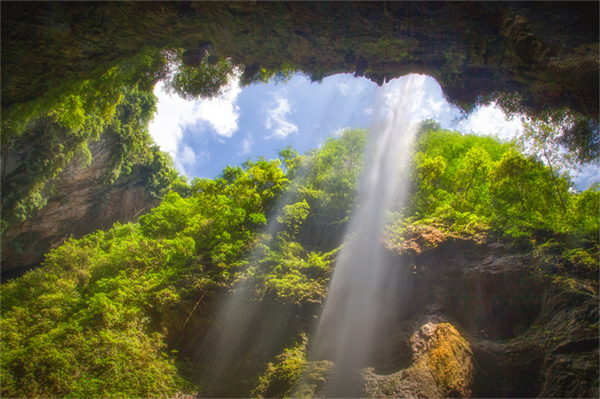 “世界奇觀”天生三橋,三橋夾兩坑、雄奇險秀,鬼斧神工。抬頭望,壁立千仞,橋體溶洞四伏,水簾高懸;低頭看,橋下溪流潺潺,噴泉叮咚。
