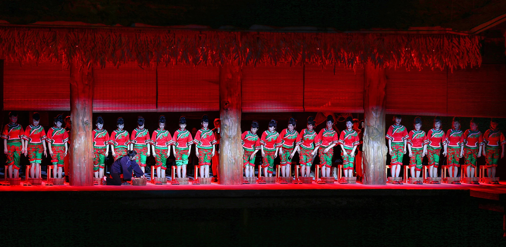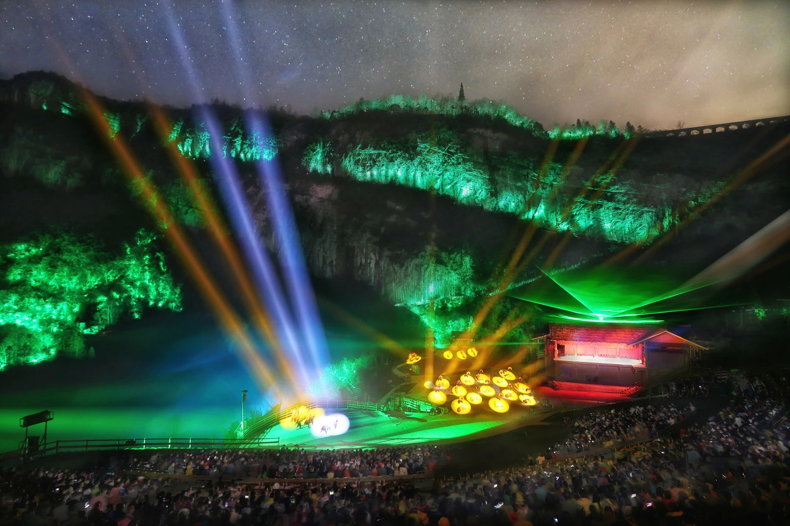 《印象武隆》是由張藝謀、王潮歌、樊躍鐵三角聯(lián)合打造的山水實(shí)景演出。演出囊括武隆巴人遺風(fēng)、山水遺情、歷史演進(jìn)的獨(dú)特文化資源,將“號子”、“哭嫁”等傳承千年卻即將消失的民俗形式以及“棒棒”、“滑竿”“麻辣火鍋”等最具重慶特色的人文元素相融合,通過70分鐘實(shí)景歌會的方式再現(xiàn)巴渝地區(qū)獨(dú)特的“號子”文化。