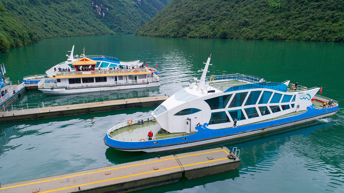 今年7月29日芙蓉江重新開放,在4年的提檔升級打造中,芙蓉江新增了9艘寓意“魚躍龍門,鯉魚化龍”的魚龍?jiān)煨腿掠未栏惺悖層慰腕w驗(yàn)更佳的游船環(huán)境。