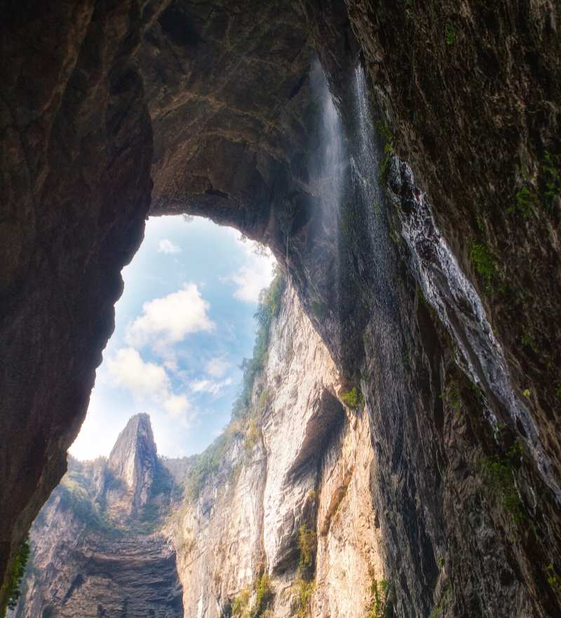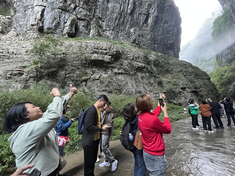 下午,大家來到有著“亞洲最大天生橋群”之稱的天生三橋景區。剛走出電梯,那天門洞開般的天龍橋便赫然矗立在眼前,其氣勢恢宏的天然石橋之態,使得眾人紛紛拿出手機拍照留念。懸崖萬丈令人深深折服于大自然神奇的創造力,甚至有游客全然不顧形象地大聲呼喊,一行人之間的氣氛十分熱烈。旅游團的成員們紛紛表示,“第一次見到武隆這種神奇的地質奇觀,感覺大自然鬼斧神工般的創造力真是太奇妙了。”