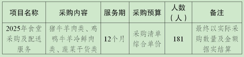 由于我司食堂固定供應商將到期,現重新開展食堂采購及配送服務比選工作,供貨期12個月,采購內容包括但不限于豬牛羊肉類、雞鴨牛羊冷鮮肉類、蔬菜干貨類(詳見附件)。