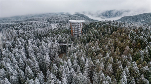 除了廣袤的大草原,仙女山的“樹頂漫步”項目更是將帶給你前所未有的體驗。穿梭在樹林間的高空棧道,每一步都仿佛踏在云端之上,四周是皚皚白雪和蒼翠的樹木交織出的自然奇觀。雨夾雪的天氣里,樹木被雪花裝飾得如同圣誕樹一般璀璨,而腳下的木板路則因積雪而變得滑軟,每一步都伴隨著輕微的吱嘎聲,那是大自然最動聽的音樂。站在森林之眼俯瞰,茫茫林海雪原,美得令人窒息。
