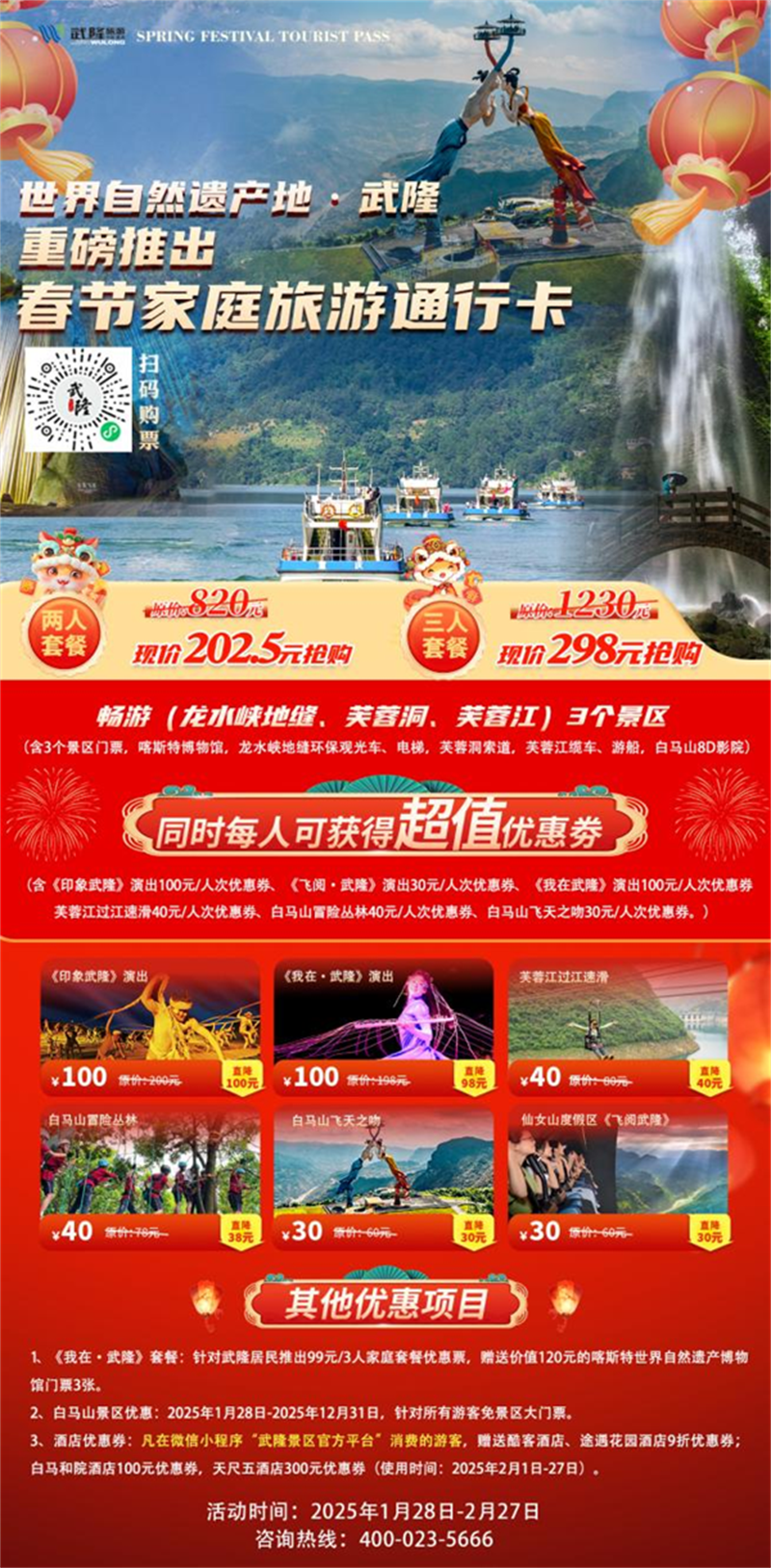 如果您計劃前往武隆游玩,一定要記得帶上“WuLong Tourist Pass—春節家庭旅游通行卡”,有了它,您能享受到超多福利,羊毛薅不停。2025年1月28日至2月27日期間,原價820元、1230元的兩人和三人套餐,只需202.5元和298元拿下,低至2.4折。套餐包含龍水峽地縫、芙蓉洞、芙蓉江3大景區(含門票、電梯、環保觀光車、索道、纜車),以及武隆喀斯特世界自然遺產博物館和白馬山8D影院。更令人驚喜的是,購買以上套餐后,還可分別享受680元和1020元的優惠大禮包,涵蓋《印象武隆》《我在武隆》《飛閱武隆》、芙蓉江過江速滑、白馬山飛天之吻、冒險叢林多個熱門項目,讓家庭游客能夠以更加實惠的價格,踏入武隆的山水之間。