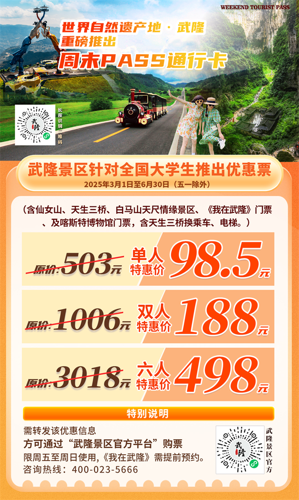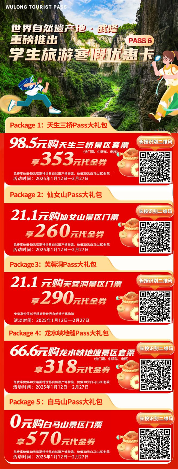 自2025年3月1日至6月30日,全國大學生均可享受單人、雙人及六人套餐的優惠,折扣低至1.7折!周五、周六、周天可用(五一假期除外),此優惠涵蓋仙女山、天生三橋、白馬山天尺情緣、《我在武隆》、喀斯特博物館門票及天生三橋換乘車、電梯,總價值最高達3018元!
