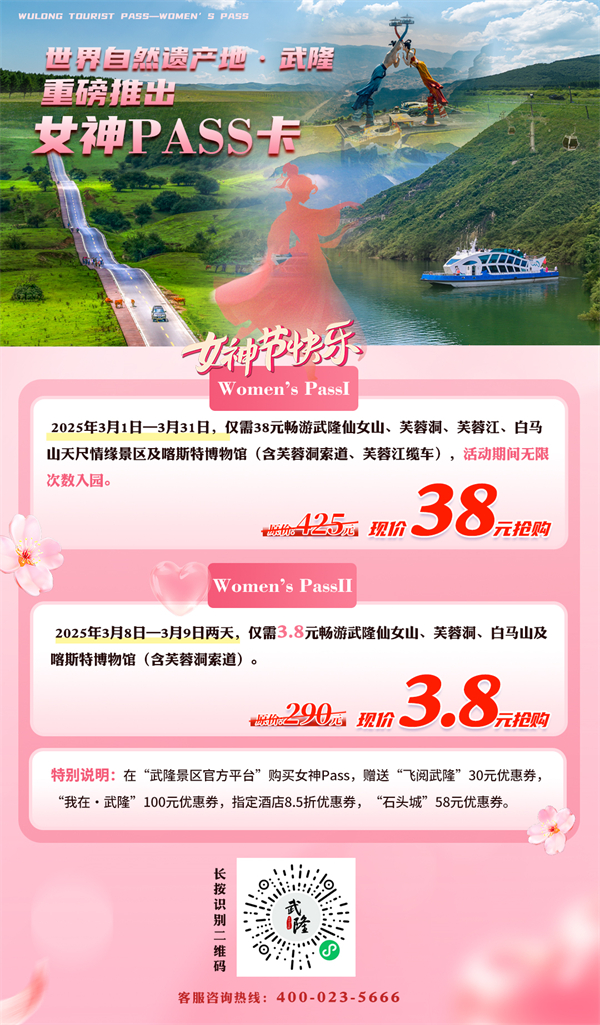 重點來了!為了讓大家能毫無負擔地暢玩武隆,武隆景區針對全國游客特別推出了超值的女神PASS卡,僅需38元,3月1日至31日,就能無限次暢游仙女山、芙蓉洞(含芙蓉洞索道)、芙蓉江(含芙蓉江纜車)、白馬山天尺情緣景區及喀斯特博物館。