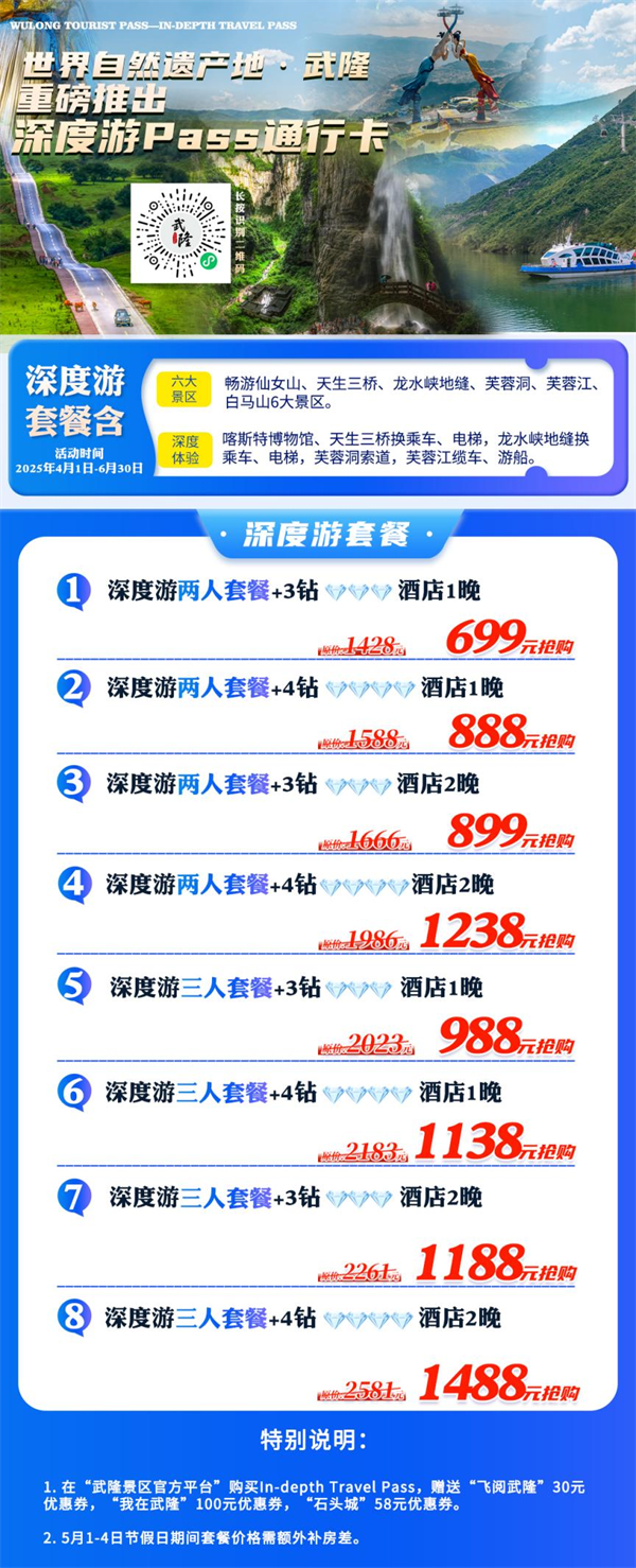 清明小長假,正是出游的好時機。武隆深度游Pass卡為您精心打造了一場旅行盛宴。趕緊約上親朋好友,一起奔赴武隆,在山水之間,感受大自然的魅力,留下一段美好的回憶!