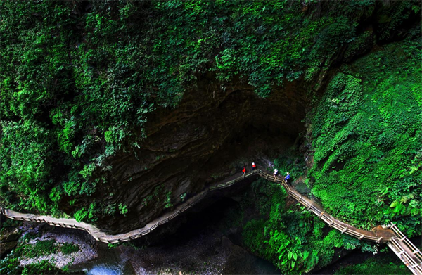 天生三橋以“三橋夾兩坑”的奇特景觀吸引無數游客來往?!稘M城盡帶黃金甲》《變形金剛4》等著名影視作品的取景地更是為之加持。沿著游覽步道前行,仿佛置身于電影場景之中,隨手一拍都是大片。