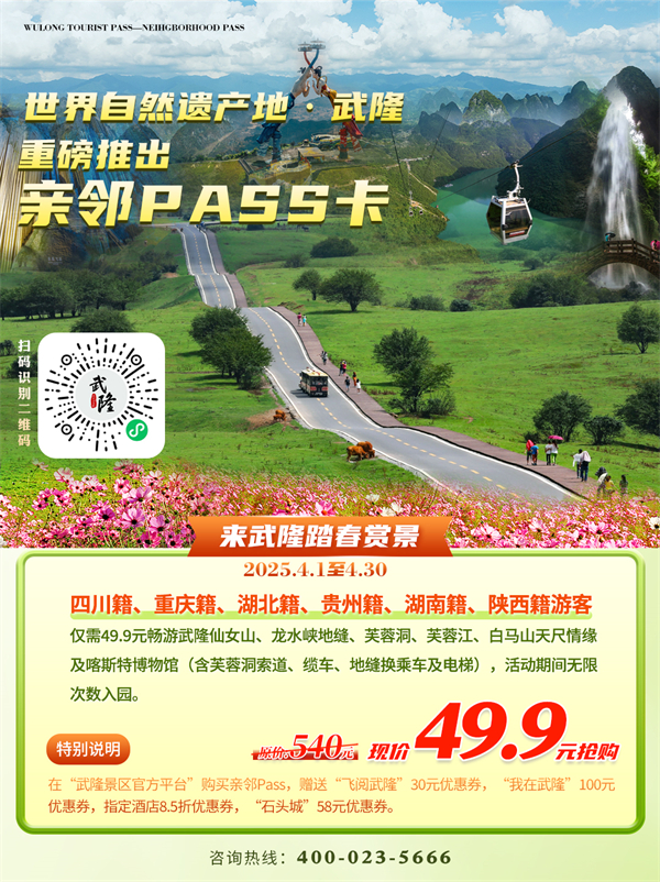 說到這兒,是不是已經迫不及待想去打卡了?別急,武隆準備了超級福利——親鄰PASS卡!四川籍、重慶籍、湖北籍、湖南籍、貴州籍、陜西籍的游客朋友,通過微信搜索“武隆景區官方平臺”,轉發武隆旅游PASS卡相關信息,49.9元解鎖原價540元的門票優惠,就能暢游仙女山、龍水峽地縫(含換乘車及電梯)、芙蓉洞(含索道)、芙蓉江(含纜車)、白馬山天尺情緣景區以及喀斯特博物館,而且4月1日至4月30日,憑本人身份證(原件)可無限次數入園,性價比超高,簡直是旅行愛好者的福音!